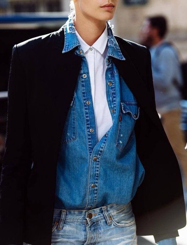 You can also get clever with your shirts and only button the top, leaving whatever’s underneath showing (in this case, a white baby tee). And the brown blazer elevates the whole look. You can also achieve this with a little denim vest underneath (we love how this one fits like a traditional waistcoat).